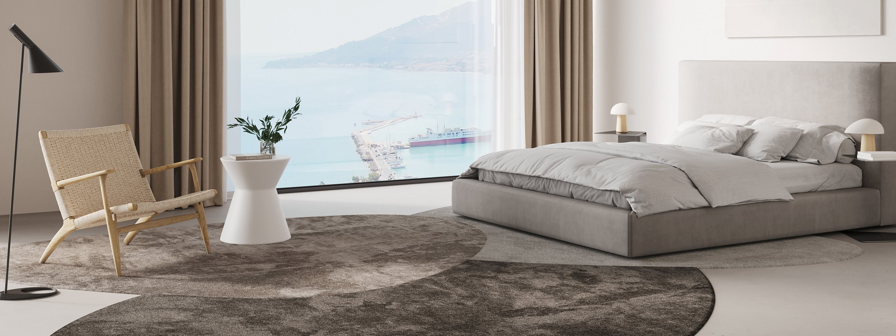 Die laminierte Rückseite ist rutschfest und macht eine Kettelung überflüssig. Dadurch ermöglicht sie einzigartige Formen mit einem minimalistischen und eleganten Randabschluss, bei dem der Flor schön bis zum Boden fällt.