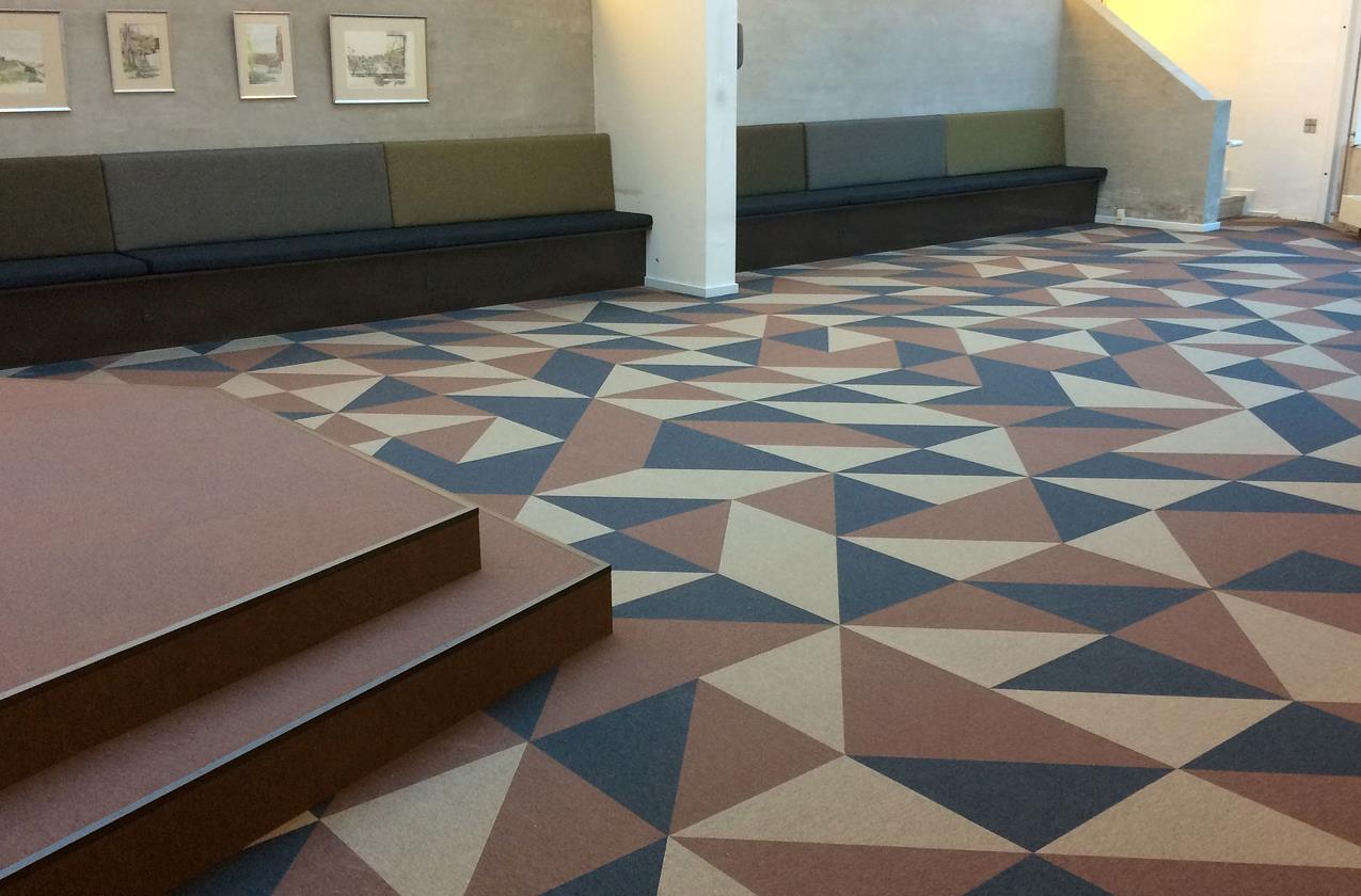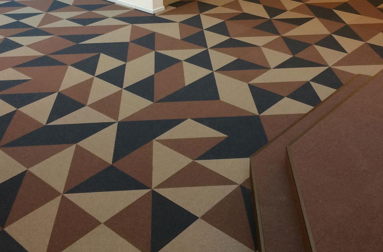 Die Sebastian Wrong by Fletco-Teppichfliesen sind in einem Lesegebiet installiert. Die Teppichfliesen sind in drei Farben und zwei verschiedenen Modulen ausgewählt: das viereckige Modul 000 und das dreieckige Modul 914.