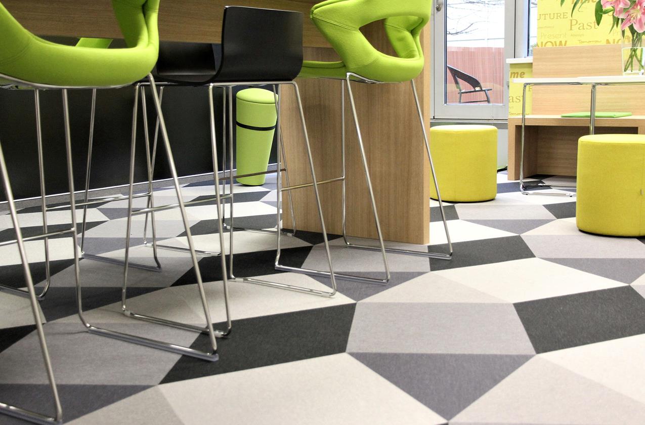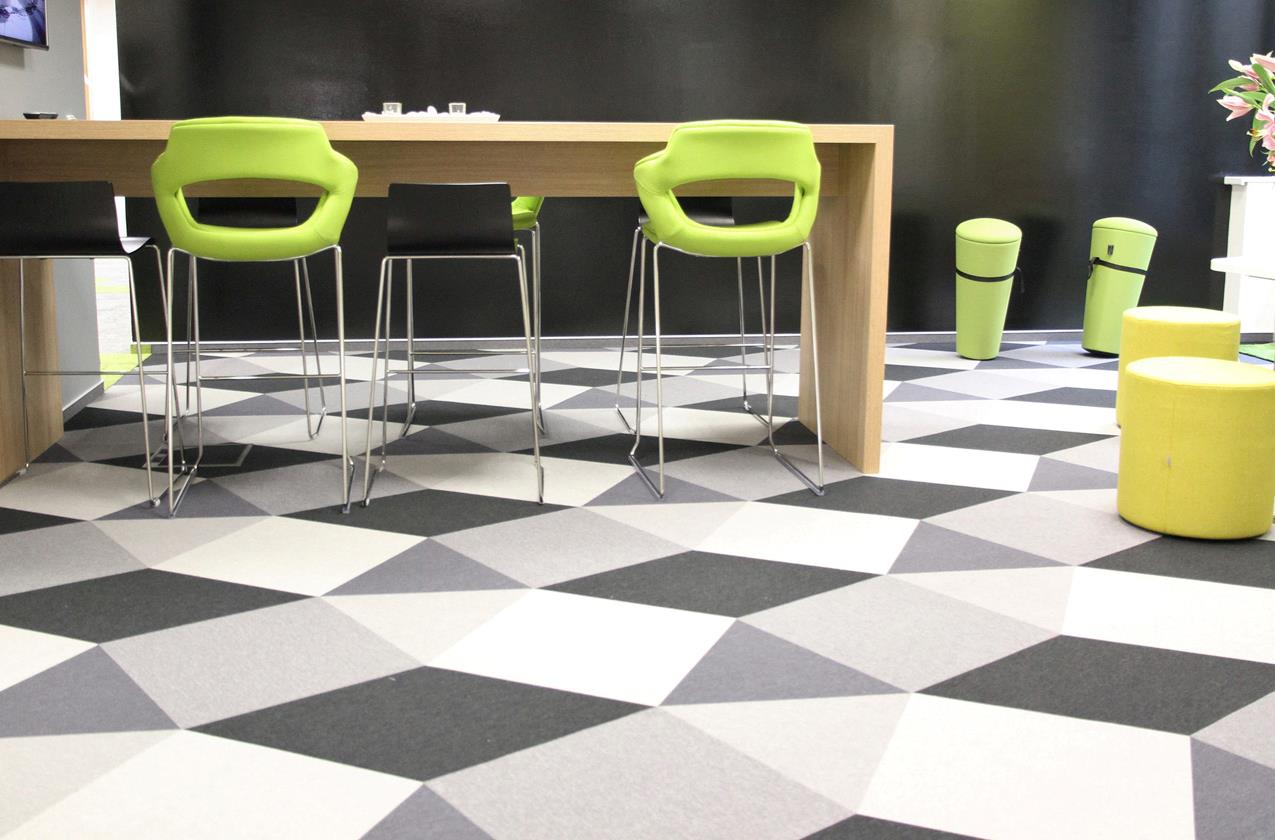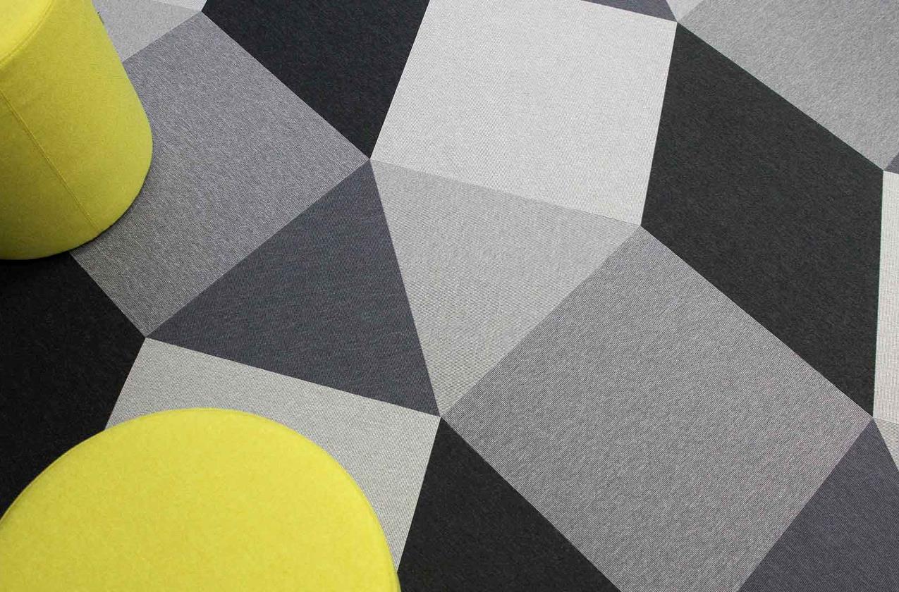 Für das Entspannungsbereich wurde Sebastian Wrong by Fletco-Teppichfliesen in fünf verschiedenen Farben und drei verschiedenen Modulen (905, 000 und 910) ausgewählt.