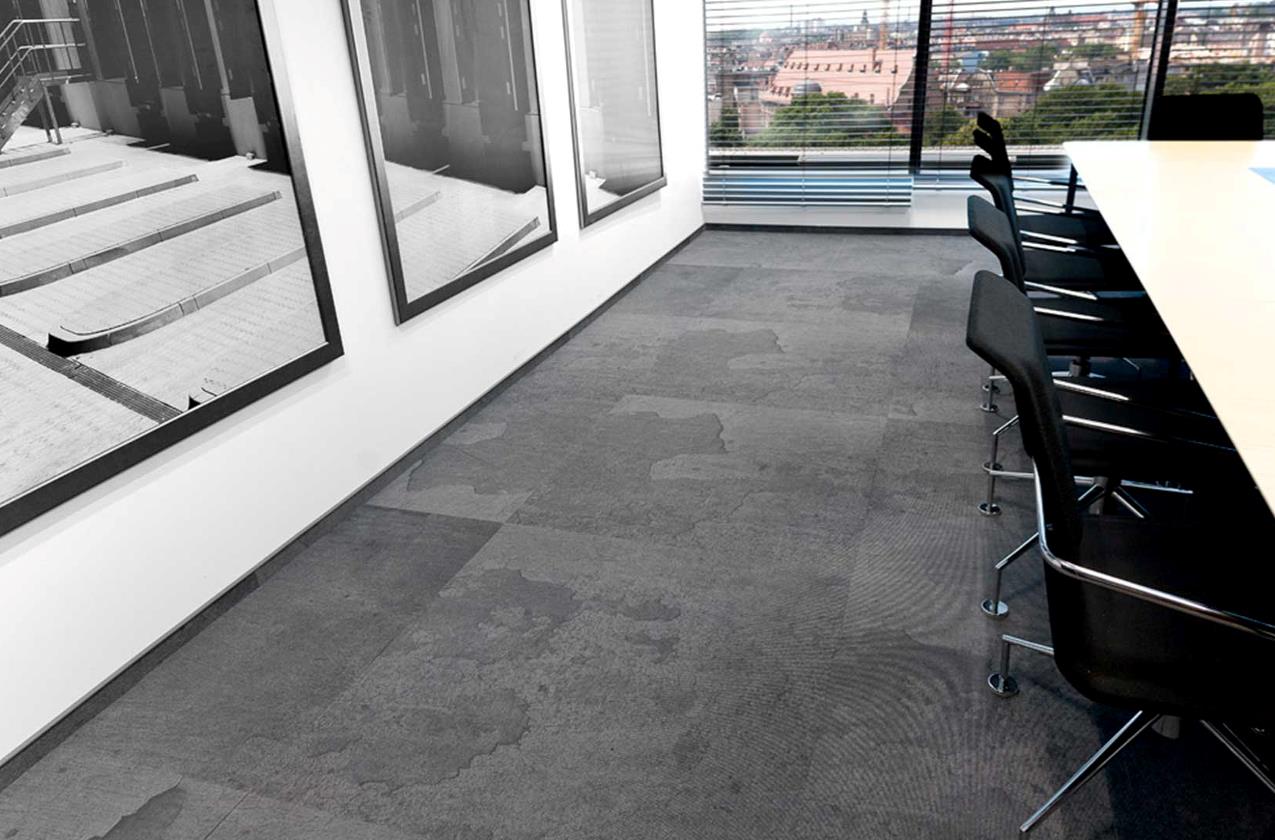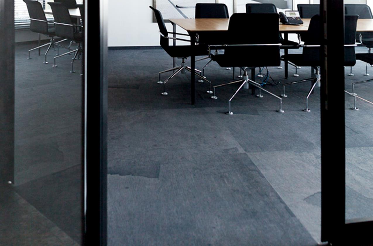 In einem anderen Konferenzraum wurde als gestalterisches Element die Teppichfliesen-Qualität Art Weave by Fletco im Format 100 x 100 cm und im Design Erosion, Farbe 300 eingesetzt. Damit wird ein moderner Look erzielt, der sich mit dem Interieur ideal ergänzt.