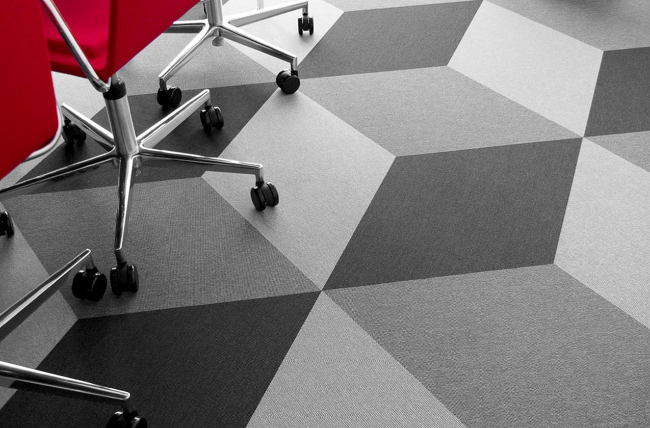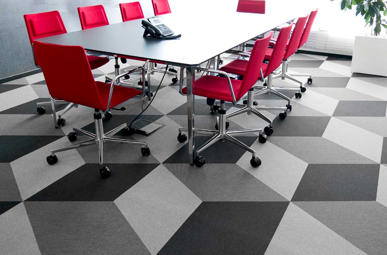 Das Sebastian Wrong by Fletco-Teppichfliesenmodul 910 dekoriert in den drei verschiedenen Farben 300, 350 und 380 in einen Konferenzraum und erzeugt optisch einen schicken 3-D-Effekt auf dem Fußboden.
