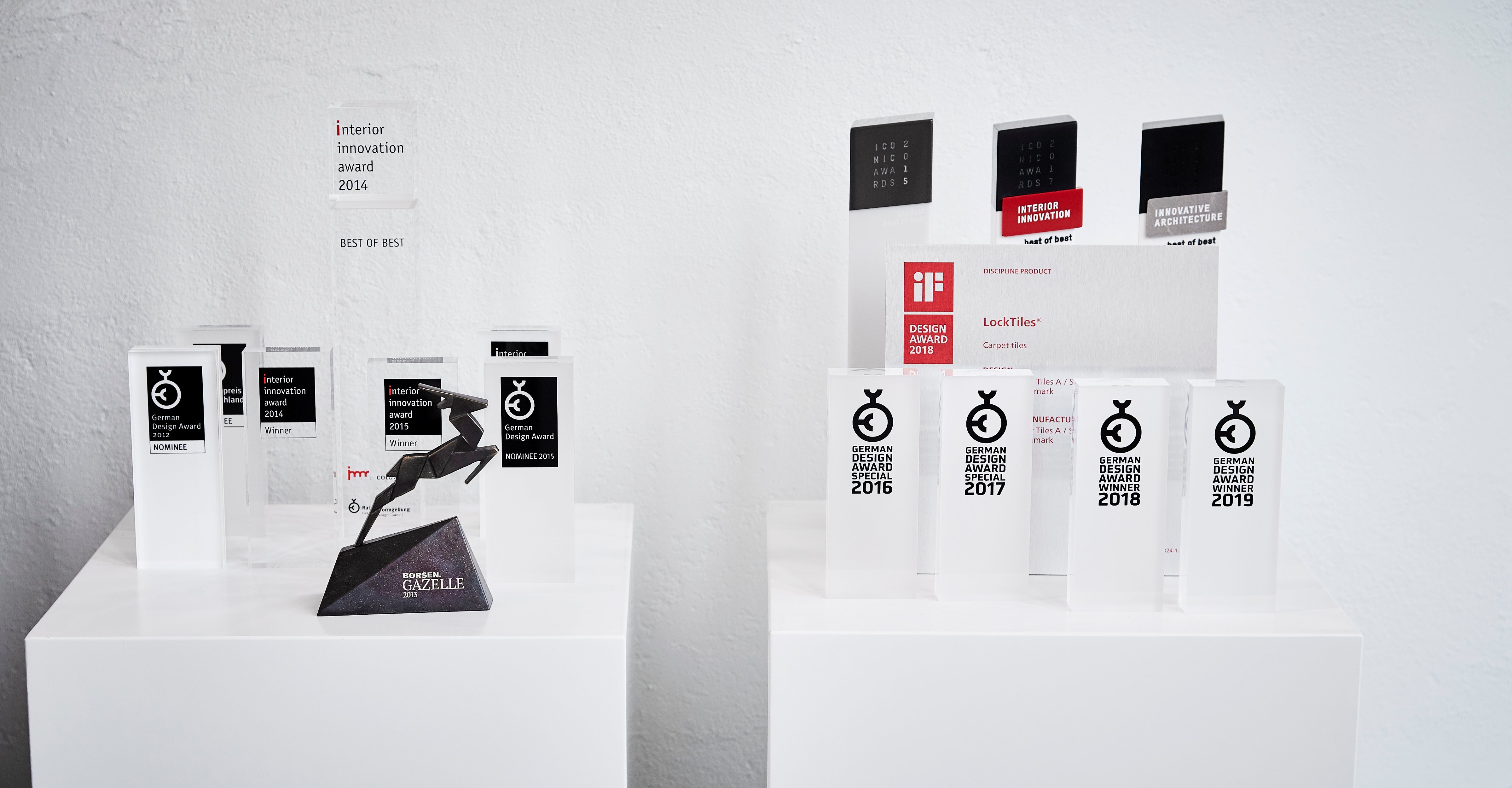 Kurz nach der Vermarktung von LockTiles® hat die einzigartige Teppichfliesenform ihren ersten Designpreis gewonnen. Bei dem ICONIC AWARDS 2018: Innovative Interior ist LockTiles® als Winner in der Kategorie Wand, Boden, Decke ausgezeichnet worden. Das Ziel der ICONIC AWARDS: Innovative Interior ist das Beste aus allen Bereichen des Interior Designs zu entdecken und auszuzeichnen.