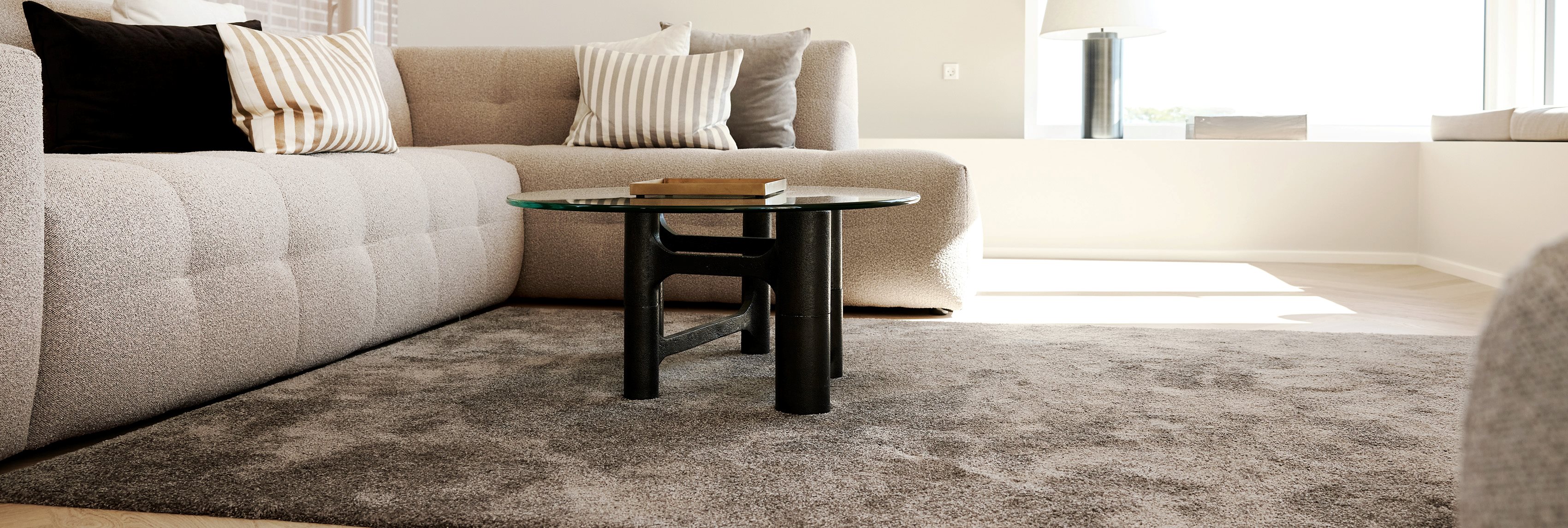 Die laminierte Rückseite ist rutschfest und macht eine Kettelung überflüssig. Dadurch ermöglicht sie einzigartige Formen mit einem minimalistischen und eleganten Randabschluss, bei dem der Flor schön bis zum Boden fällt.